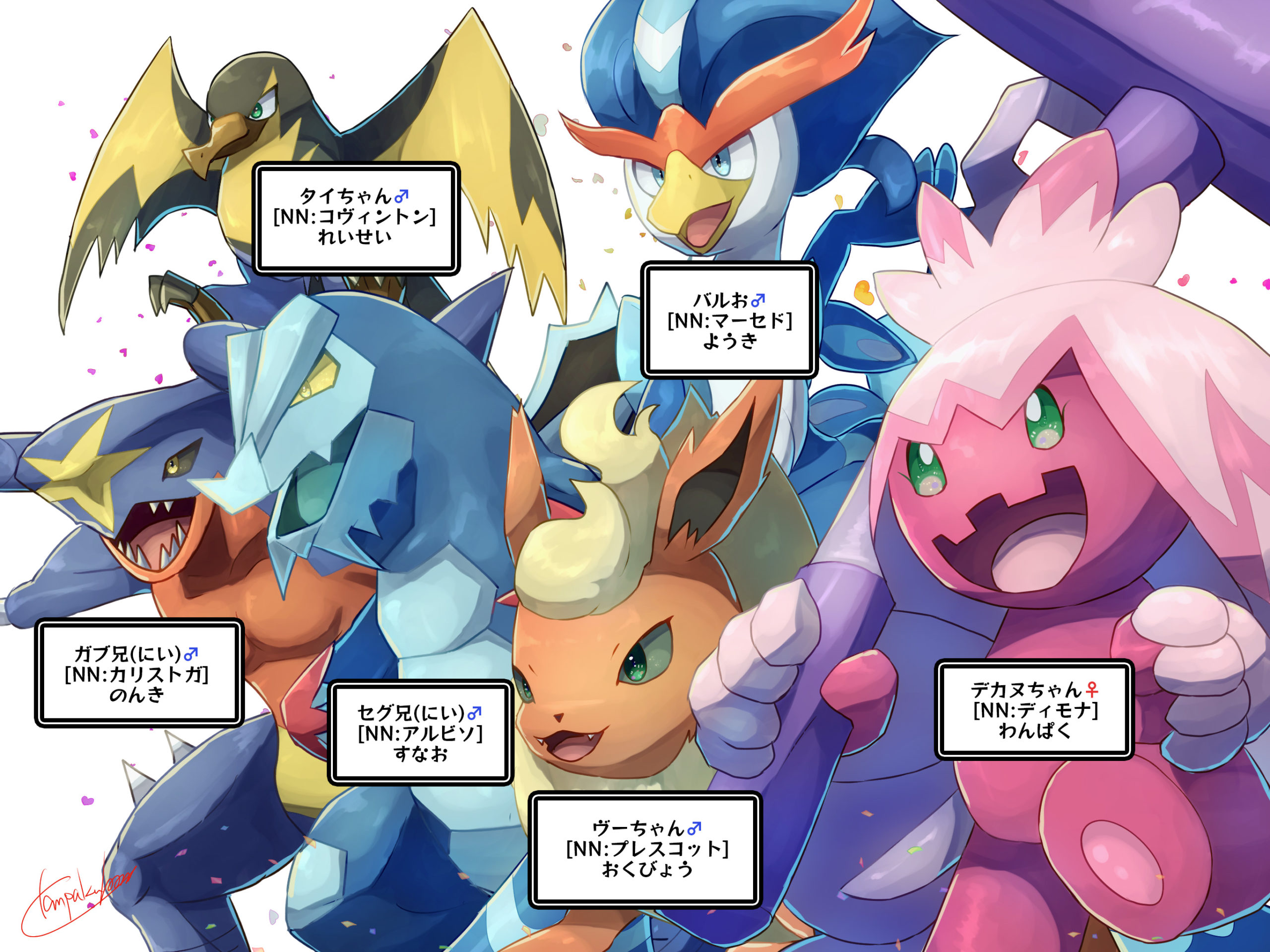 名前と性別はゲームと同じだけど、性格は揃えると大変なので創作をやるときに動かしやすいよう変えた。先に性格や性別を決めるとHGやPtのときみたいに対戦するわけじゃないのにタマゴをひたすら割らないといけないので妥協した。本来はこれ以外にも途中入れ替わったり助っ人がいくつかいるけど、ジム巡りの後半はこのメンツで固まった。ブイズが入ったりドラゴンが2匹入るのは今回がどちらもはじめて。