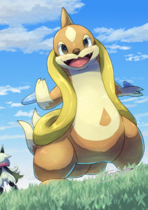 このキャラ、正面から見ると本来は馬面?のような感じになりそうだけど思い切ってデフォルメ。多分このほうがかわいいはず。なんだかブイゼルに見えなくもない。あと画風がかわいくないとかいうのもナシで。