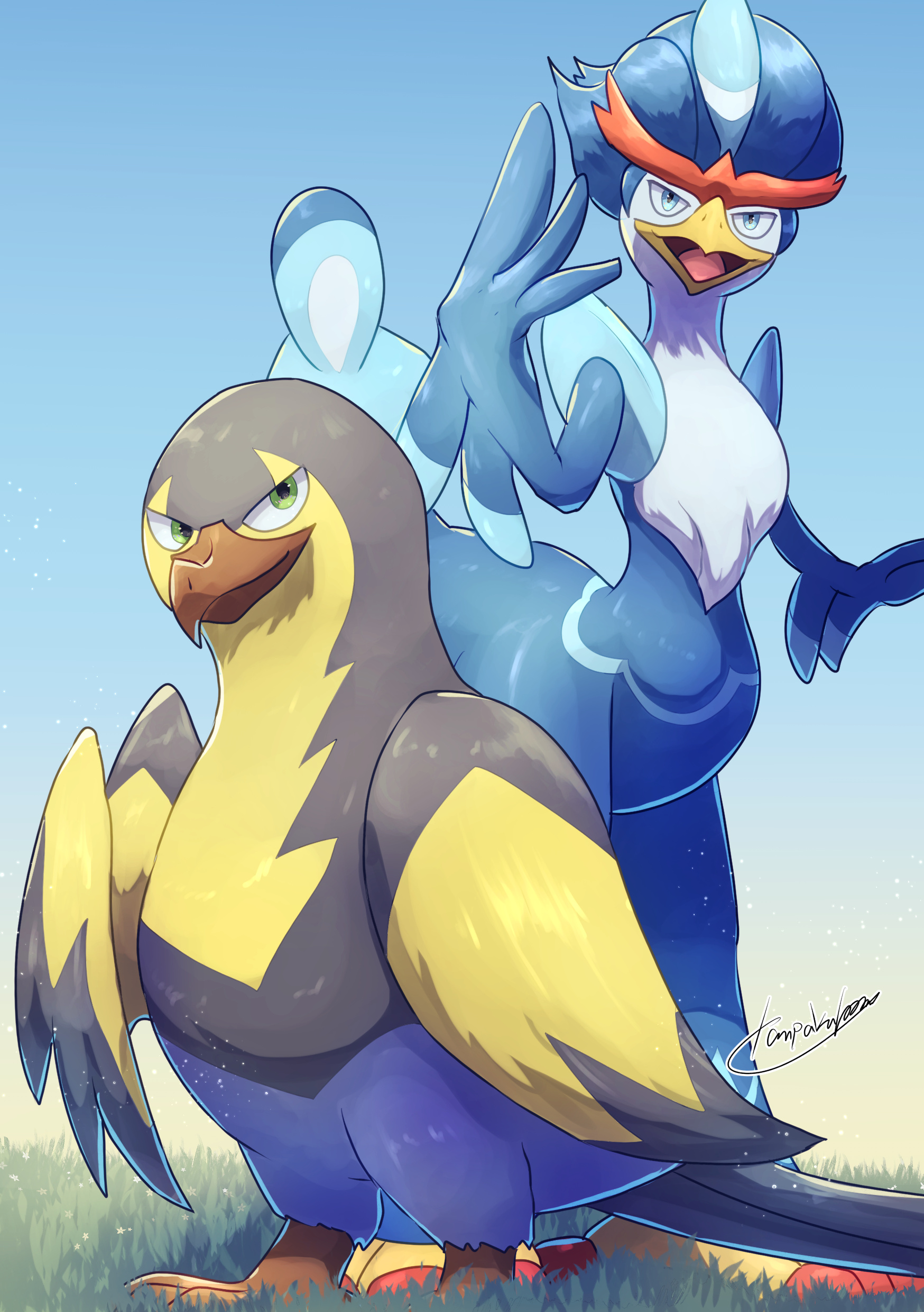 パルデアイケメン鳥ポケモンコンビだと思ってる2匹。直立二足で人間に近いウェーニバルと鳥に寄ったタイカイデン。どっちも鳥だけど大きく違う見た目でどっちもイイ…って感じ。とりだいすき。