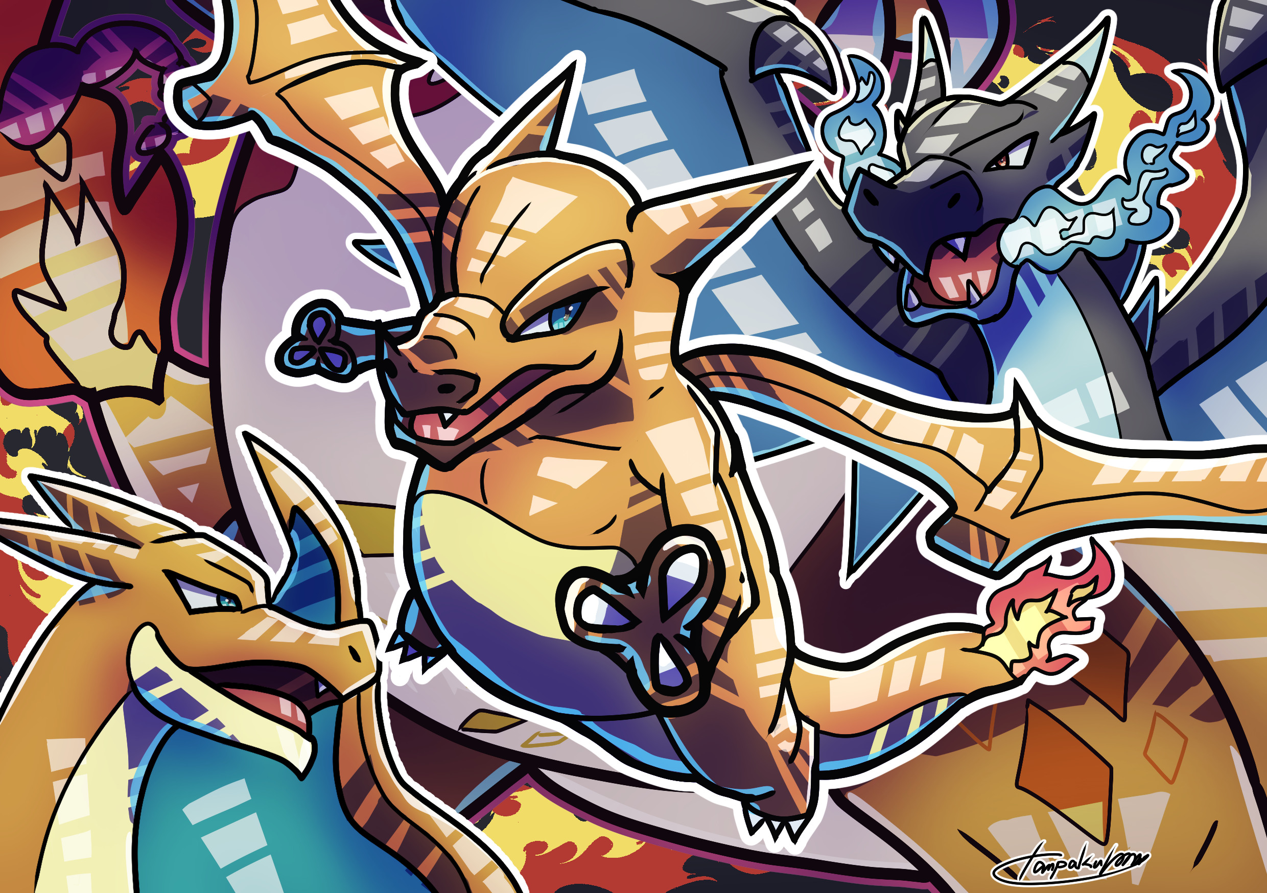 令和6年6月6日(不吉な並びにも思える)のスーパーリザードンデーということで制作。今回は迫力を出したかったのでメリハリが強いこの画風で攻めることに。メガリザ2種や色違いを並べるだけだとやる人が多そうなのでキョダイマックスもわずかだけど盛り込んだ。キョダイはこれが描くのが初めてだったりする。ガラル自体全然描いてねーじゃねーか!というのもあるけど、ホントにそろそろ描かないと偏りが激しすぎる。