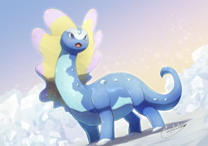 立体図鑑という強力な資料が使えなくなってしまったがゆえに御三家以外を描くことがあまりなかった6世代。もちろん化石系も例に漏れず初描きとなった。ヒレ?はゲーム仕様のグラデがかかっているタイプではなくアニメ仕様のくっきりした2色の分かれ方をしてるタイプにした。アニメ塗りなんかだとこういう処理にしたほうがすっきりするので他にもドラパルトやコライドンを描くときなんかはやる手法。単純に面倒だからという理由ではない。