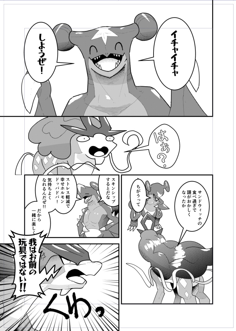 ガブリアスとのバトルに負けたスイクン。ガブのリクエストを受け入れるべくサンドウィッチの準備をしていたが、希望内容は「イチャイチャ」であった。拒否をしたいが約束をした以上仕方なくやる羽目に。嫌々ながらやるスイクンの気持ちは果たして…