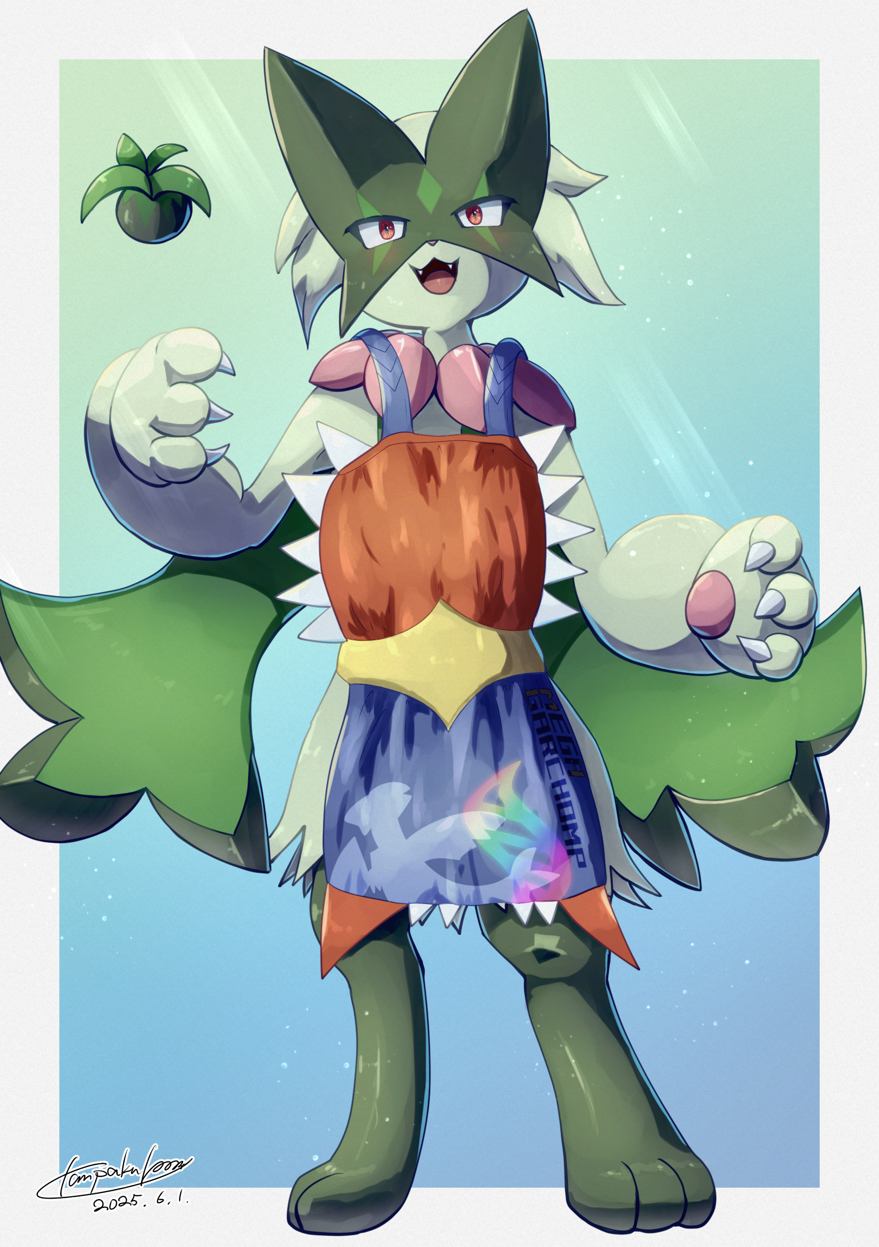 お手軽なふくの絵を描きたいな、と思ってたらメガガブリアスの身体がエプロンみたいに見えたので制作。誰に着せるか選定したときに下描きで止まってたマスカーニャがいたのでマー君に着てもらった。そう、♂である。